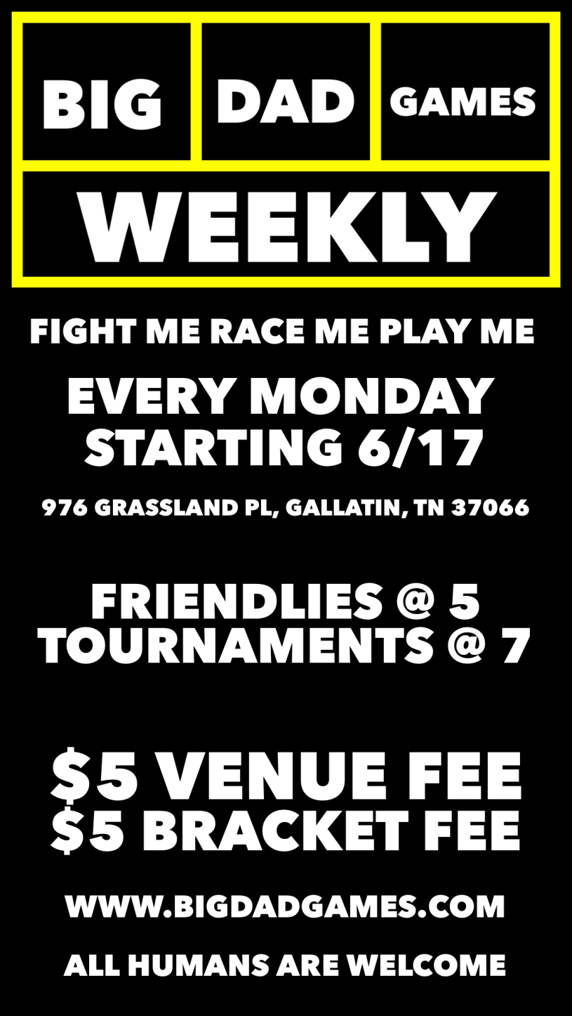 We are launching our own weekly in Gallatin! Expect Smash Bros, Mario Kart, Tetris, Rocket League and more! Starting at 5 o’clock we will feature a variety of friendlies and then at 7 we will run tournaments for any game that has at least four players. Just like that! If you want to bring your own setup then we’ll waive the venue fee. We have plenty of space! ALL AGES WELCOME!